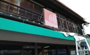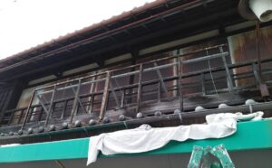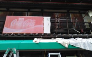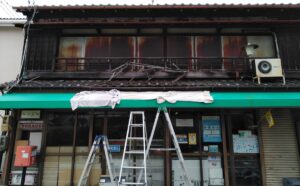 2026年4月24日 看板・テントの撤去工事 三重県桑名市内堀で軒先上の看板撤去|2026.2.24 三重県桑名市内堀で軒先上の看板撤去をさせていただきました。 看板表示面のトタン撤去中 看板本体の木枠を切断しながら撤去中 看板撤去完了